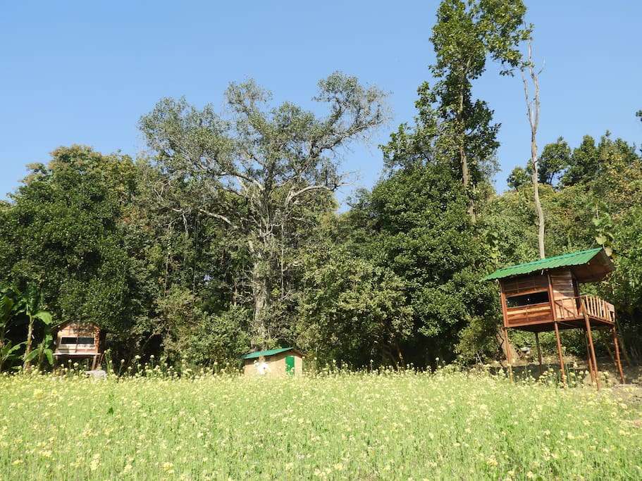 The tree house gives an easy access to the village kyari so once can opt for a village tour or guided nature walk and experience the lives of the villages who have been staying since decade around the oldest national park. To access the tree house room one needs to climb a wooden ladder. The stay is simply furnished and equipped with floor laid bedding and a table. There are 2 such tree houses facing each other which can accommodate 4 guests. Washrooms are outside a few meters from the tree house near the dining area. Meals are prepared from the organic produce by the host family’s kitchen, dine along with the host along with their fantastic stories of jungle.One can enjoy staying away from city life and see how villagers have been contributing to the wildlifes and learn the basic jungle rules. At night listen to the sound of insects along with star gazing. But don't forget to rise early to catch the glimpse of golden sun rays falling on the vast green field ,birds chirping and animals calling out their clan.